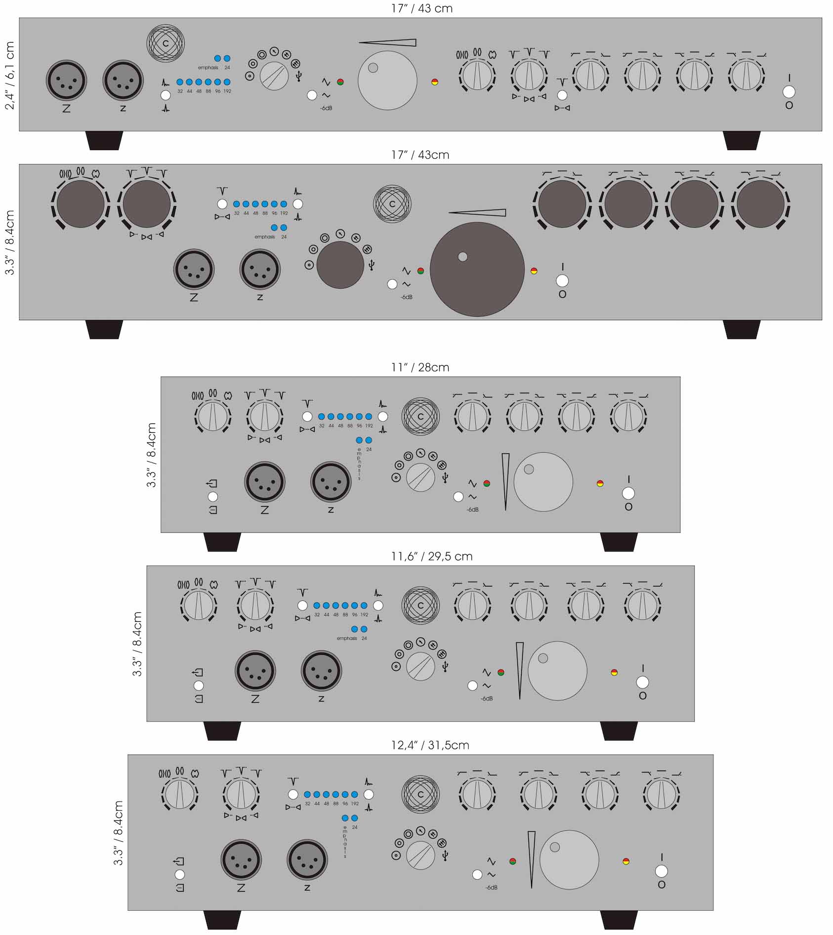 Dennoch ist uns das Aussehen nicht unwichtig. Durch die viele Bedienelemente ist es nicht möglich zu einem sehr elegante Design zu kommen. Lake People kam mit dem Vorschlag den Verstärker 43 cm breit zu machen. Dies entspricht die "Standardabmessungen" vieler HiFi-Geräte. Gerne hätten wir jedoch eure Meinung dazu. Deshalb im Anhang eine GIF-Datei (5400x6000 Auflösung) mit einige Design-Beispiele. Laßt uns bitte wissen was ihr davon hält.