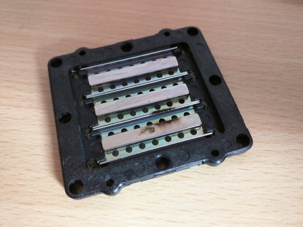 Im Detail sieht man, wie schwer die Beschädigungen sind. Das Kupfer der Kupferbahn hat sich stellenweise verflüchtigt, die Folie selbst ist lokal verbrannt. Teile des Kupfers wurden sogar auf einen der Magnete "aufgeschweist". Da ist leider nichts mehr zu machen...