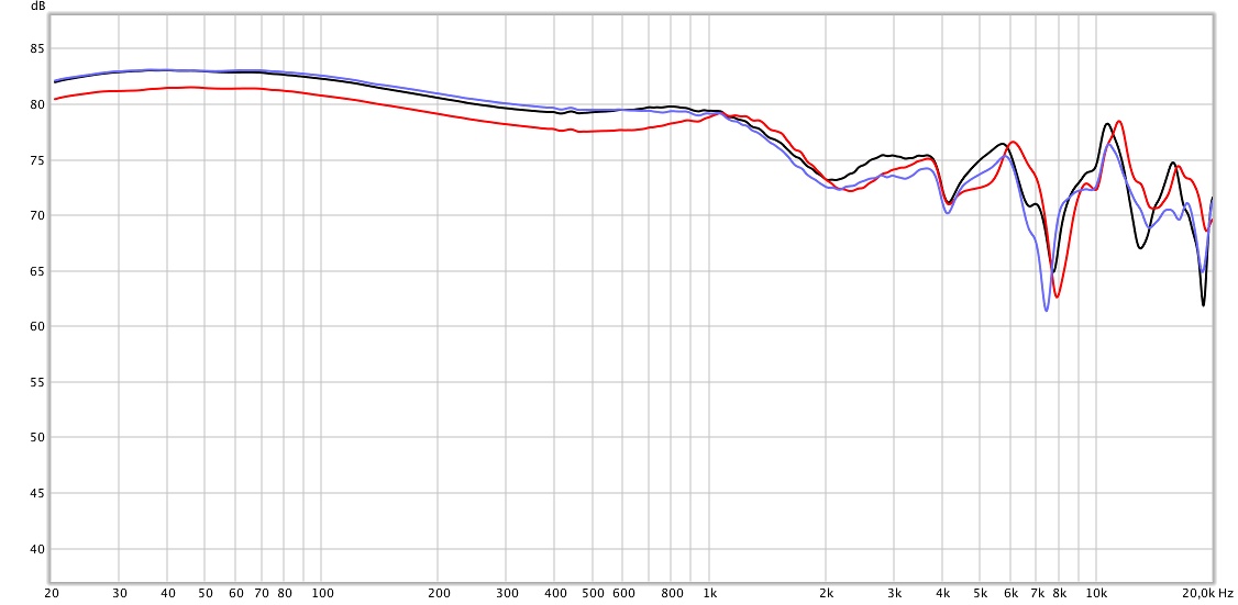 Man erkennt, dass beide Polster oberhalb von 1000 Hz kaum einen Unterschied machen. Anders sieht die Sache aber im Bereich darunter aus, die untere Hälfte der Klaviatur wird deutlich lauter wiedergegeben, wobei die grundsätzliche Signatur ebenfalls gleich ist.